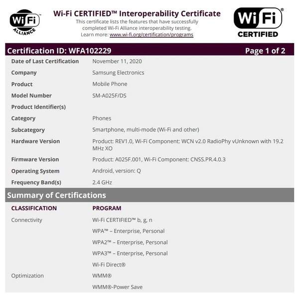 A02(SM-A025F)和M02(SM-M025F)现在已经收到了Wi-Fi联盟的认证。支持的文档显示,这两款智能手机均具有单频Wi-Fi b/g/n、Wi-Fi Direct,运行Android 10。根据先前的报道,A02和M02搭载骁龙450处理器,拥有2GB/3GB RAM、32GB内存和microSD卡插槽。
