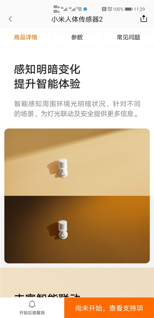 小米人体传感器2可根据环境光亮暗检测,比如夜间起床,感应后可联动开灯,让灯光随身而动。