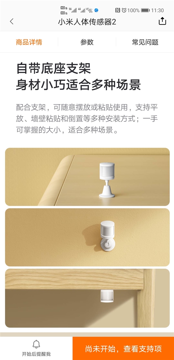 小米人体传感器2体积小巧,自带支架,可随意摆放或粘贴使用,支持平放、墙壁粘贴和倒置等多种安装方式,可适应多种场景。